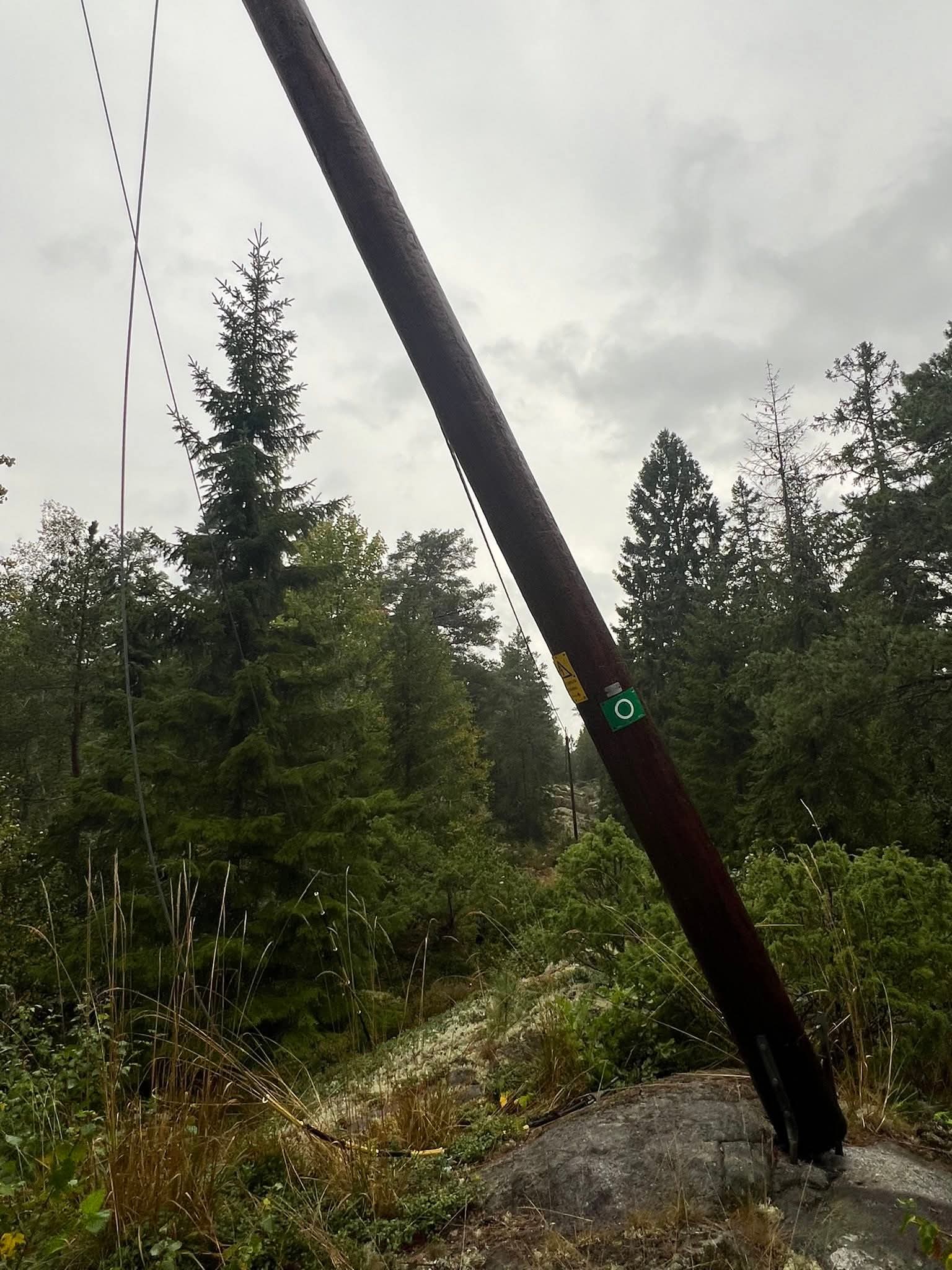 Trädet har dragit ner ledningen till marken, och en elstolpe har brutits loss då fundament och förankringslinor gett vika. Även andra stolpar i området verkar ha påverkats.
